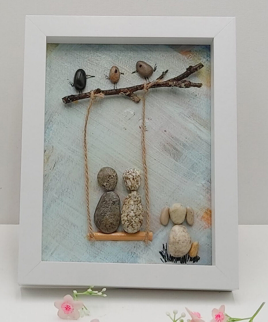 Cette création pleine de tendresse représente deux personnages en galets installés côte à côte sur une balançoire suspendue à une branche. Au-dessus d’eux, trois petits oiseaux perchés semblent veiller affectueusement sur la scène. Le fond, peint à la main dans des tons doux et pastel, évoque la lumière du matin au bord de l’eau.
