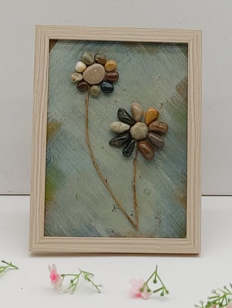 Cette création met en scène deux fleurs en galets aux teintes douces, dressées sur leurs fines tiges végétales, accompagnées d’un papillon délicat aux ailes naturelles. Le fond vert pastel apporte fraîcheur et luminosité à cette composition pleine de poésie.