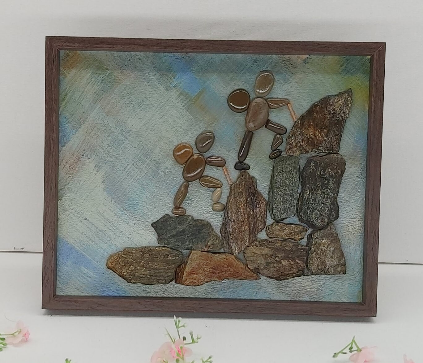 Cette création pleine d’énergie et de vie représente un groupe de randonneurs en pleine ascension, gravissant avec courage une paroi de rochers. Chaque personnage est minutieusement composé de petits galets aux formes évocatrices : un tronc solide, une tête ronde, parfois un sac à dos suggéré par une pierre plus sombre. Les silhouettes s’élèvent pas à pas, dans une harmonie minérale qui évoque la force du collectif et la beauté du chemin.