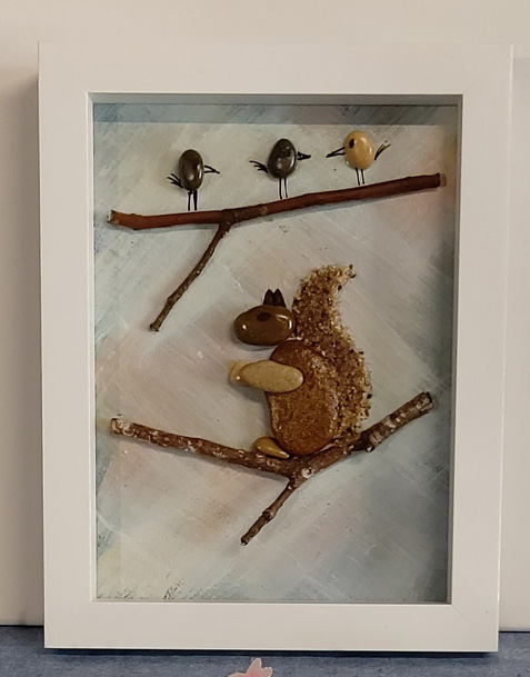 Cette création met en scène un adorable écureuil perché sur une branche, observé par trois petits oiseaux posés juste au-dessus. Chaque galet est choisi avec soin, puis travaillé pour donner vie à cette scène pleine de douceur et d’harmonie.