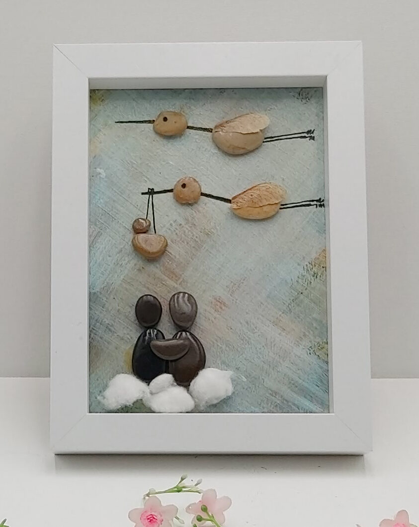 Cette création raconte une tendre histoire : une cigogne en galets apporte un bébé emmailloté à un couple d’amoureux émerveillés. Chaque galet est choisi avec soin pour donner vie à cette scène remplie de douceur, de bonheur et de promesse. Les formes naturelles des pierres deviennent des personnages pleins de charme, témoins d’un moment magique : l’arrivée d’un enfant.